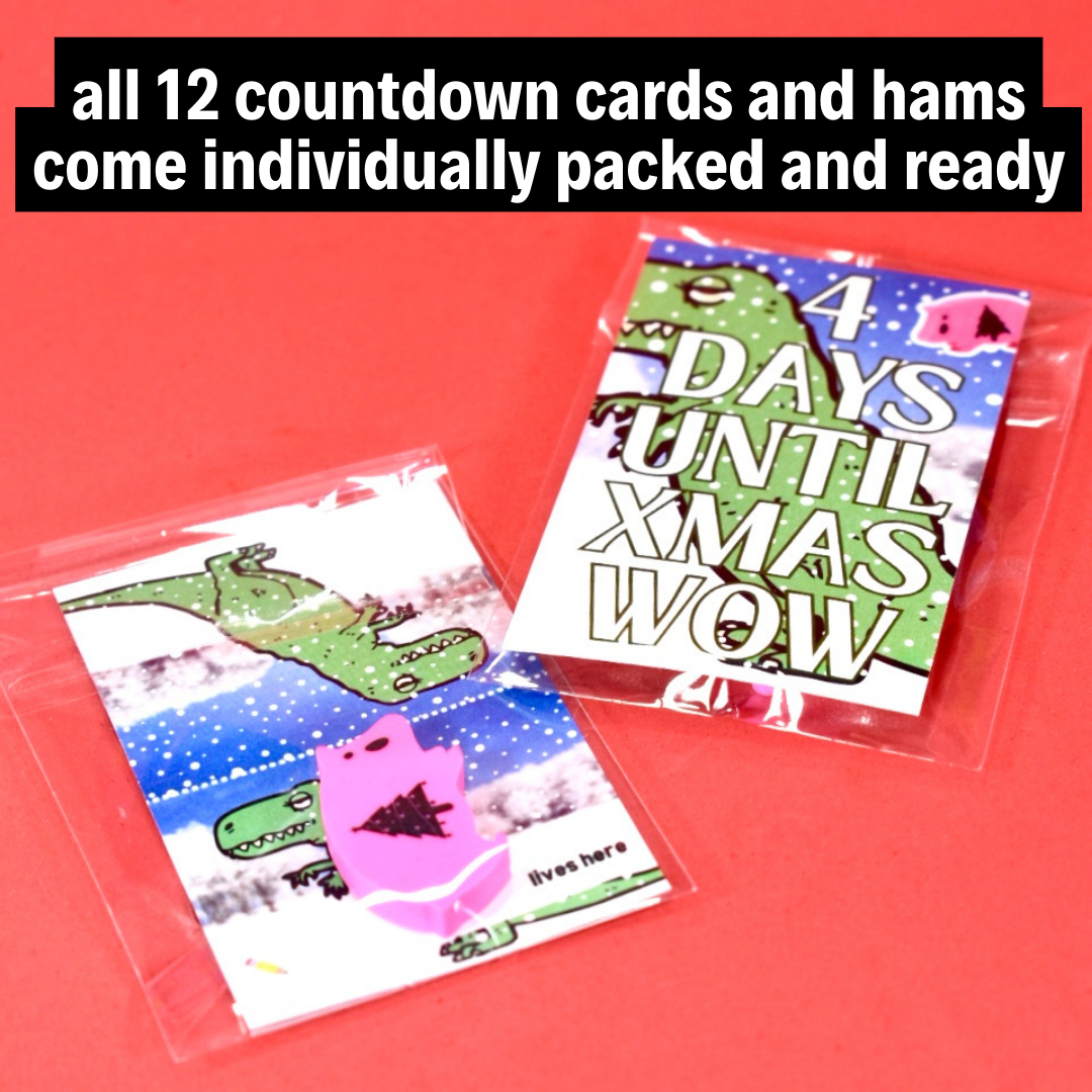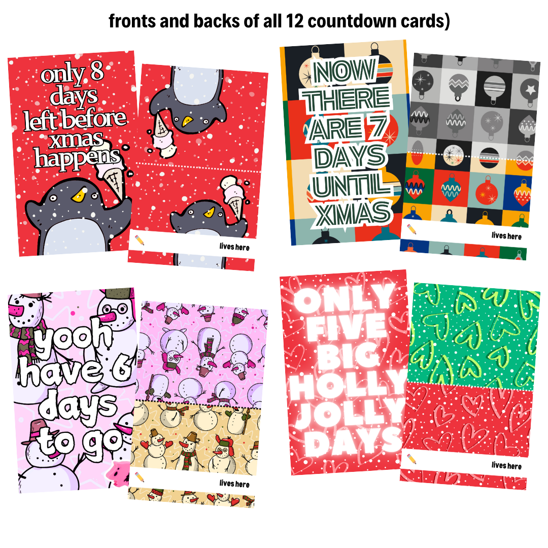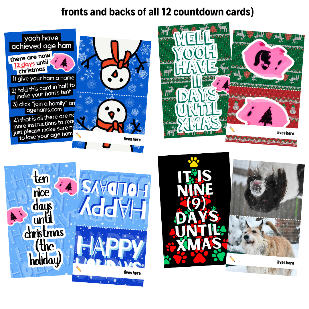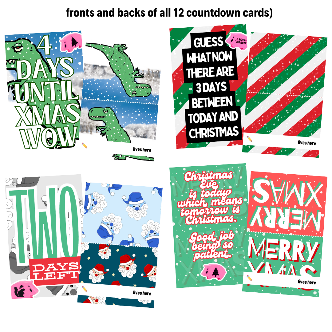 this series of 12 cards and age hams will help your kids countdown to christmas without having to hide that elf all over the place