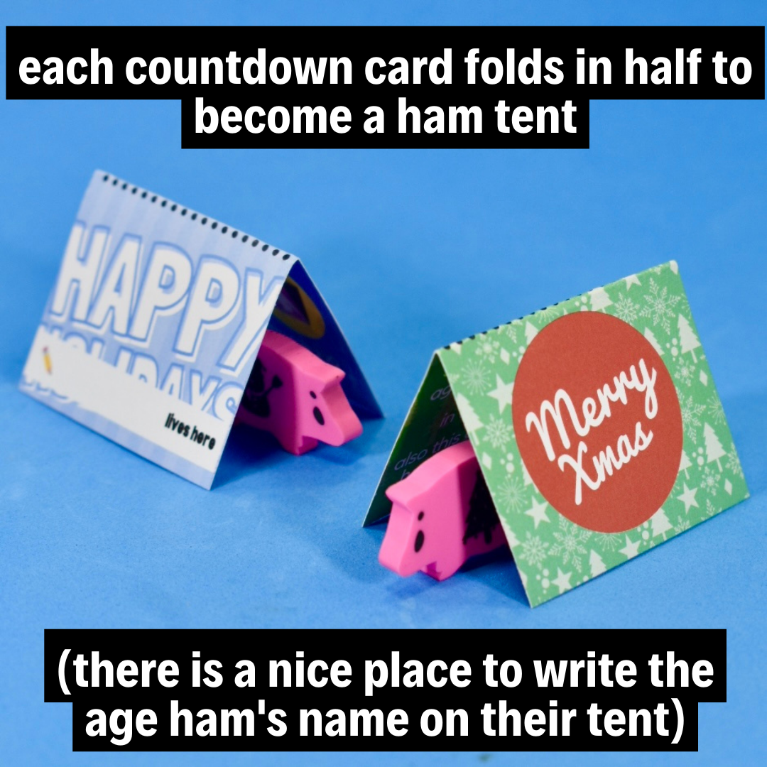 each card comes with a different age ham (see photos for which ones) and the card itself can be folded in half to become a ham tent