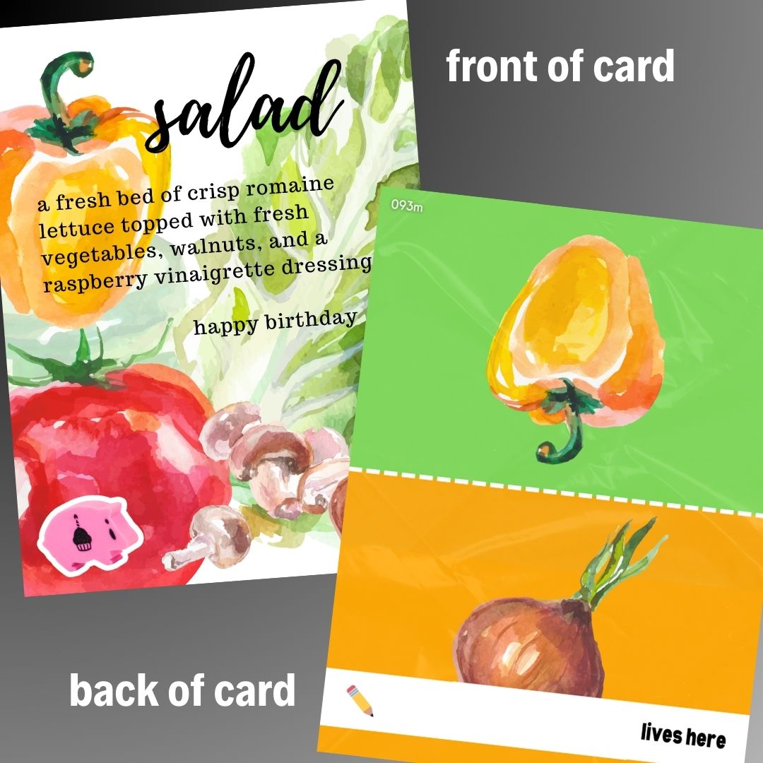 everyone wants this card it is for a happy birthday experience and it has a salad recipe on it